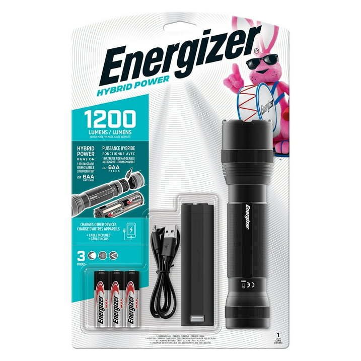 Shine a bright light on dark situations with the Energizer Hybrid Tactical Light. Powerful performance and rugged construction come together in this tough metal LED flashlight. Stow one in your pack as a camping light, or place one in your home as an emergency flashlight. Up to 15x brighter than standard LED light technology, the rechargeable flashlight casts a beam reaching over 650 feet. High and Low modes provide the right amount of light for your task, and Strobe light helps you stay ready for an emergency. The outdoor light operates using either AA batteries or the rechargeable battery pack that comes included. This rechargeable light fully charges in 8 hours via a USB charging cable and has a USB port-out that allows it to charge your other devices. An aircraft grade aluminum body and shatterproof lens offer rugged durability, and a rear push button makes this Energizer flashlight easy to use. Trust in Energizer for reliable performance in any situation.