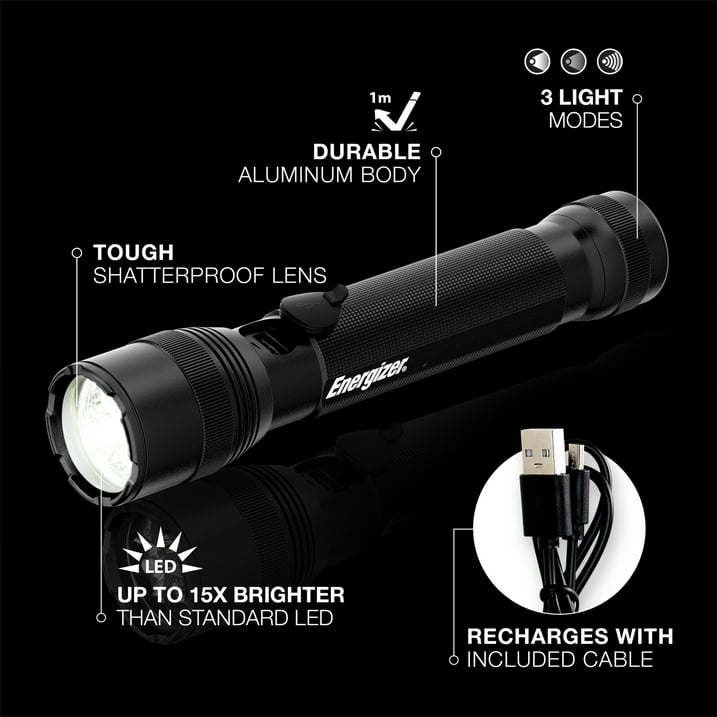The Energizer TAC R 1200 Rechargeable Tactical Flashlight delivers high performance in an aircraft-grade aluminum body for reliable use in various situations. Up to 15x brighter than standard LED technology, this is an excellent rechargeable flashlight for camping trips, outdoor work sites and indoor jobs that require bright light. The powerful beam reaches 200 meters on High mode. Low mode helps you conserve power with a 15-hour runtime. Strobe mode is at the ready to use as an emergency light. IPX4 Water-resistance, impact-resistance up to 1 meter and a shatterproof lens help this LED flashlight shine the way through bad weather and tough terrain. A push-button tail switch allows for one-handed operation. The rechargeable light features a built-in lithium ion battery that you can charge again and again with the included cable. A USB port-out lets you charge your other devices—a useful feature in emergencies. Trust in Energizer for reliable performance in any situation.