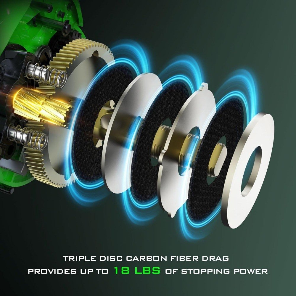 • IMPRESSIVE POWER AND CASTABILITY - The Zephyr baitcasting reel's triple disc carbon fiber drag provides plenty of fish stopping power with up to 18lbs of maximum drag. And the DTCC (Double Tapered Control Chute) Line guide allows line to leave the spool with less friction, meaning greater casting distance and fewer backlashes.