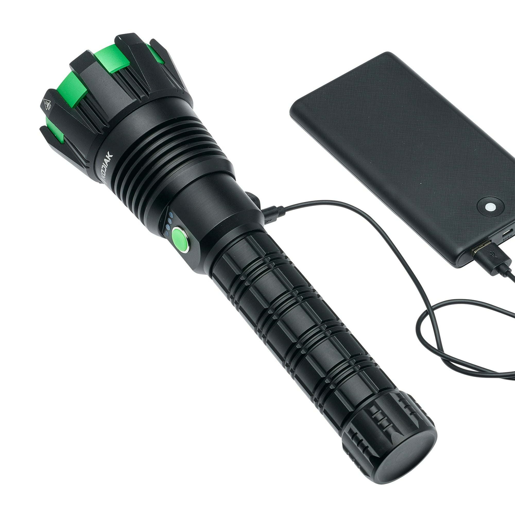 The Kodiak Kolossus is a rechargeable 15000 lumen COB LED tactical flashlight. The flashlight features a twist to focus beam. A 5000 mAh lithium-ion battery powers the flashlight and also acts as a power bank to charge smartphones. Four brightness modes of15,000 lumens (30 seconds), 10,000 lumens (2 Hours), 3000 (5 Hours) and 300 (30 Hours) Lumens. Double click manual lockout prevents accidental operation or overheating. Auto lockout after 2 minutes of non-use. The Kodiak Kolossus is IPX4 weather resistant and 1 meter drop tested. Aerospace grade aluminum construction ensures long lasting durability.