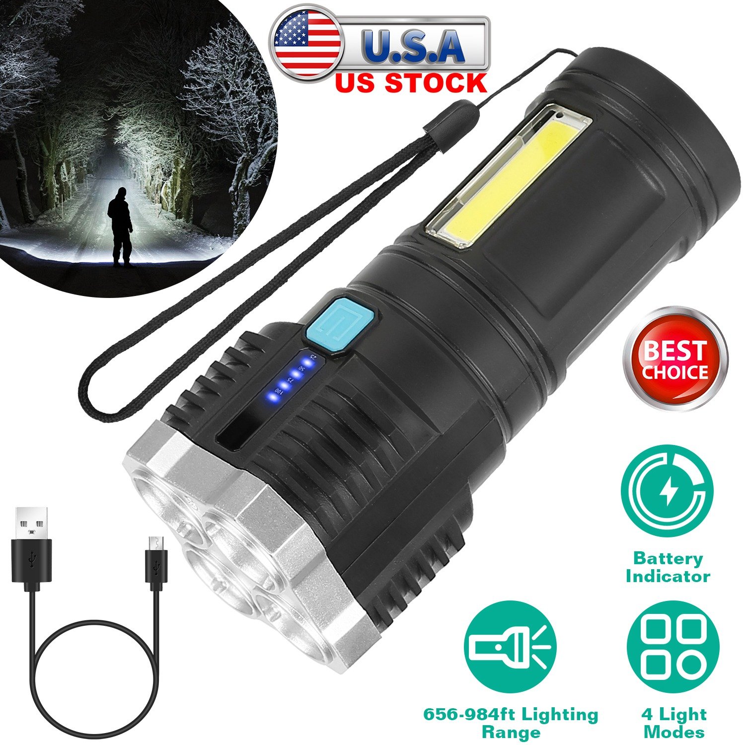 This rechargeable flashlight is designed with 4 light modes, high brightness, low brightness, flashing and COD. It can be applied to work, emergency, and outdoor activities. The flashlight always remains brightest with a lighting distance between 656-984ft. Made of ABS material, durable and wear-resistant. The attached strap makes it easier for carrying. A must-have daily item for everyone.