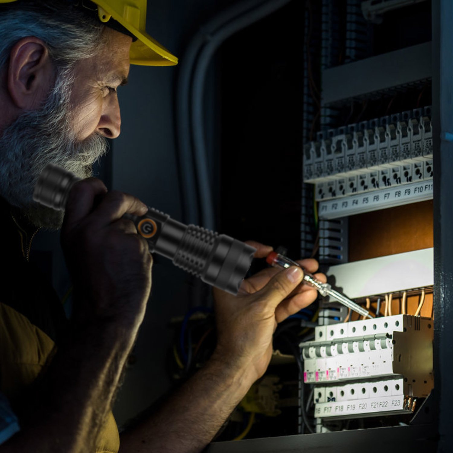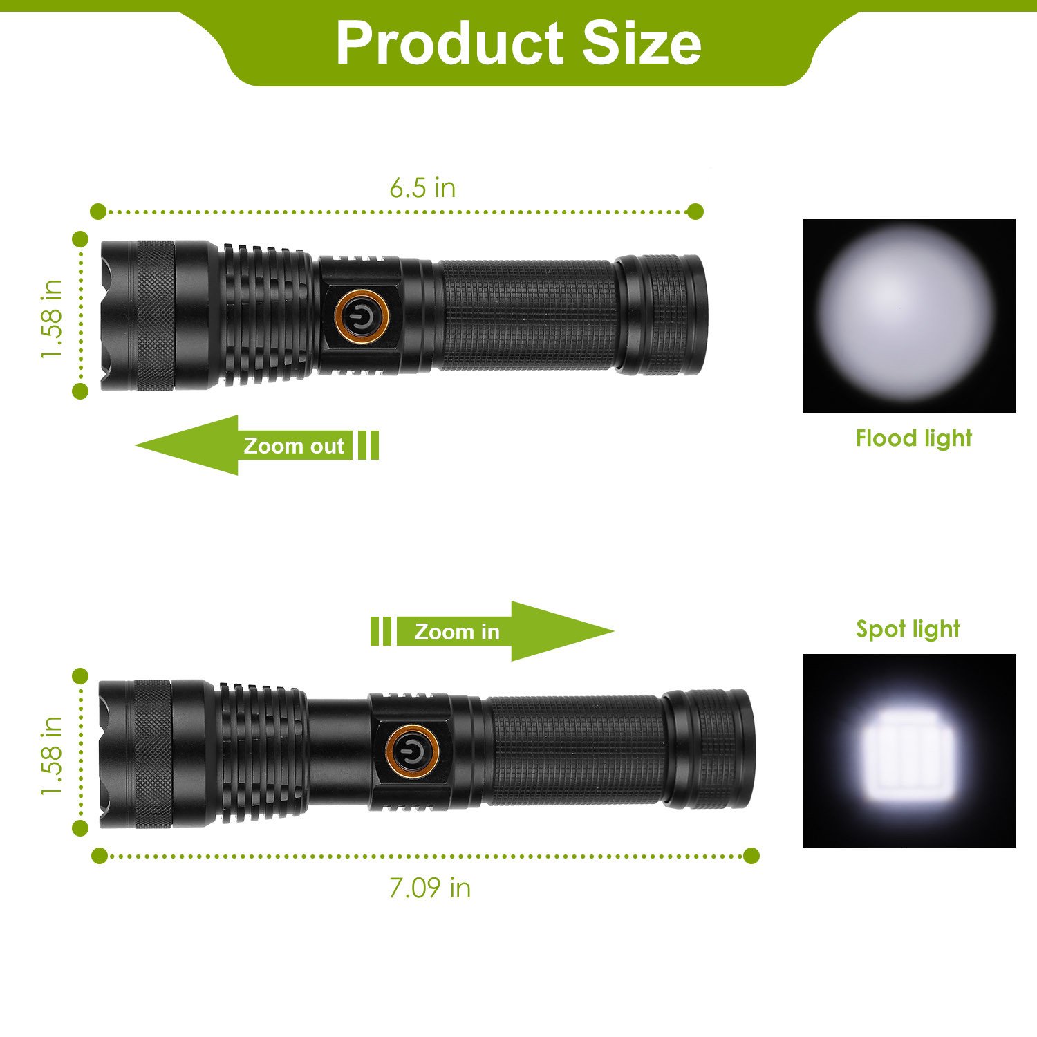 *Zoomable Flashlight & Adjustable Focus*:Our premium P50 LED torch supports 656ft lighting range;easy-controlled head-pulling zoom adjusts focus range for different usage; stretching to adjust its focus and get spot beam and flood beam you need. Bright zoomable focus is optimal for distant observation and wide range illumination.